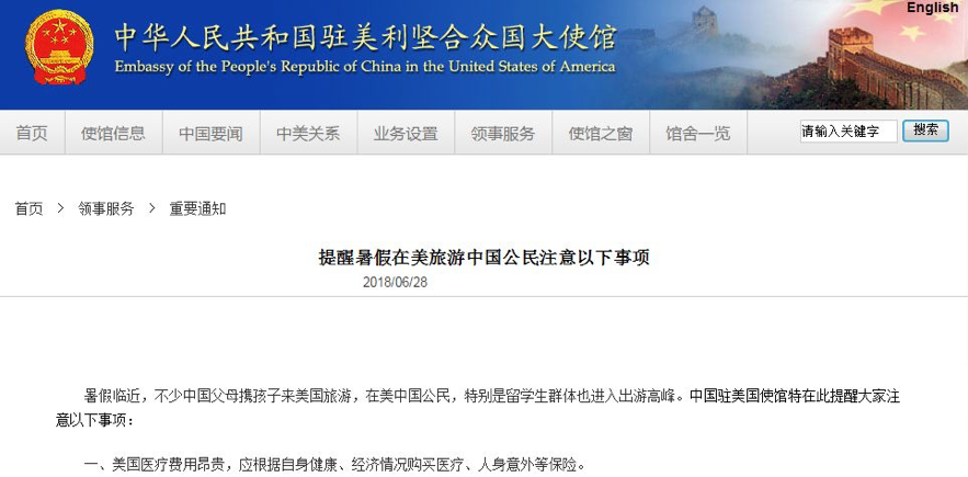 中国驻美国使馆提醒暑假在美旅游中国公民注意以下事项